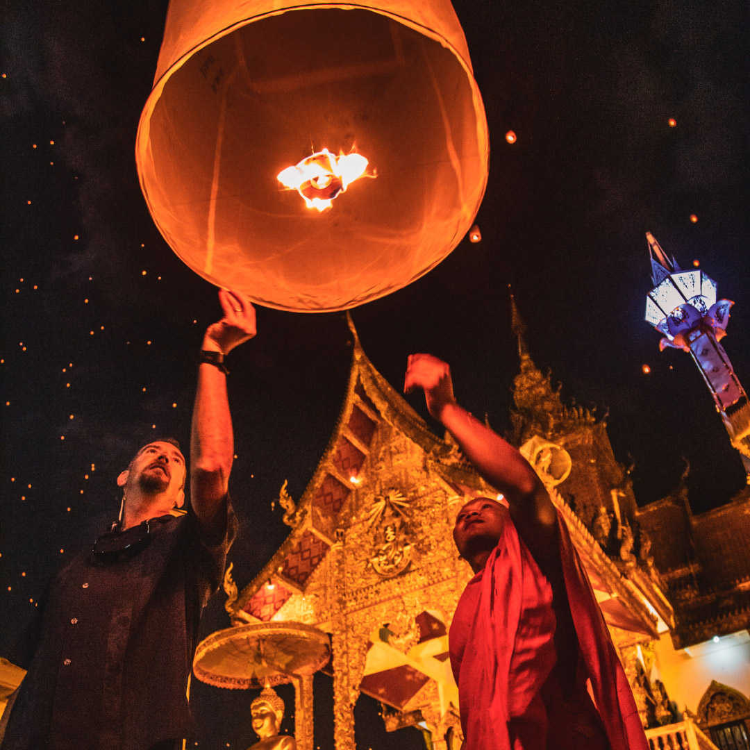 Los relucientes templos y budas dorados enmarcan tanto los entornos rústicos como los modernos. Las ancestrales higueras de Bengala se visten ceremoniosamente con telas sagradas para honrar a los espíritus residentes, pequeños altares adornan y protegen desde los hogares más humildes hasta los grandes centros comerciales, y las guirnaldas en los salpicaderos de los vehículos salvaguardan a sus ocupantes de los accidentes de tráfico. Luego están los retiros de meditación de Chiang Mai, las fiestas religiosas del noreste, las cuevas-santuario de Kanchanaburi y Phetchaburi, y los templos cimeros del norte.